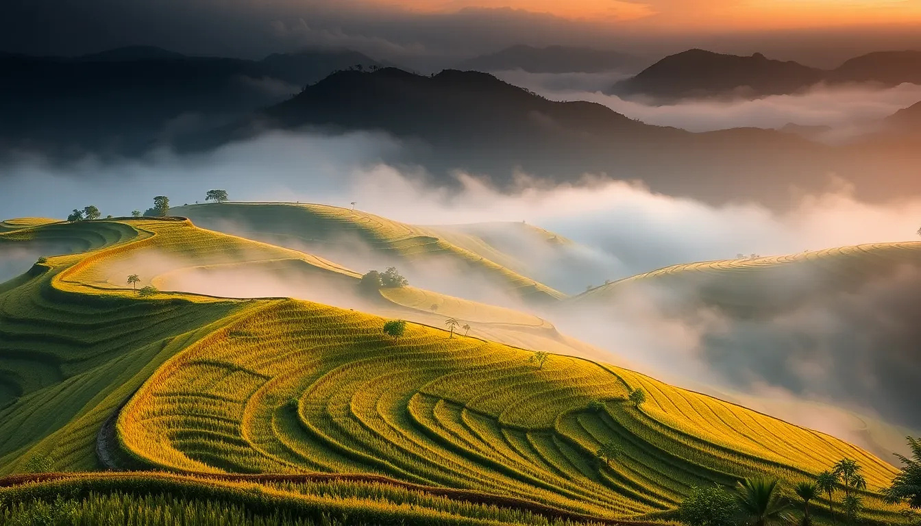 Glistening rice terraces of Vietnam at dawn, mist rising from valley, leading S-curve pattern, wide dynamic range, oil painting