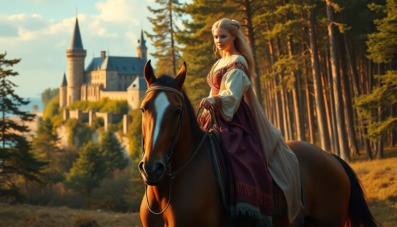 Princess of Sweden in full body riding a brown horse in the forest, , oil painting, background: the castle, the beach