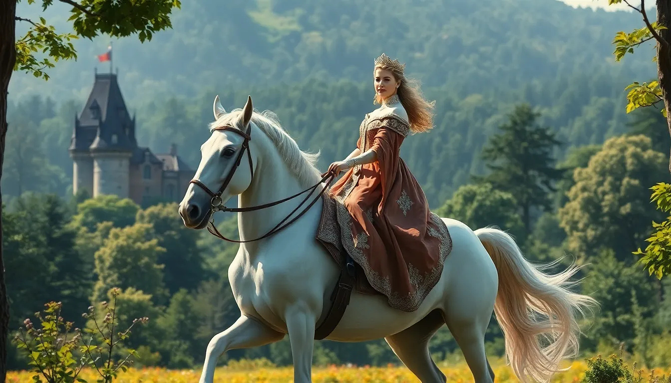 Glorious Princess of Netherlands in full body riding a white horse in the forest, background: the castle, the garden