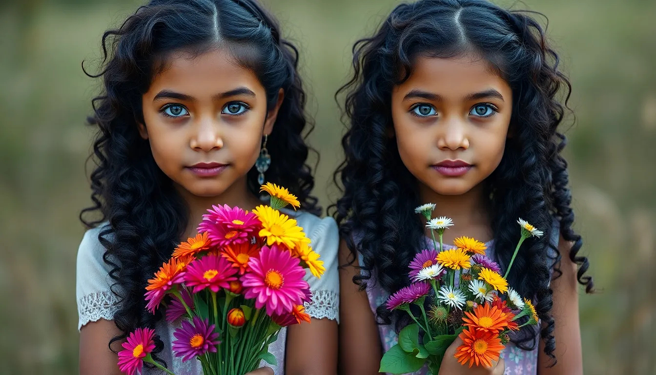 2 beautiful 11 years old girls, long curly black hair with green eyes, colorful flowers bouquets in their hands